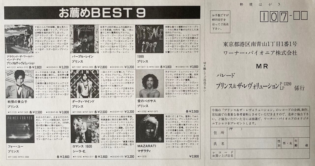 '86年。Prince And The Revolution名義での傑作3rd!アンケートハガキ付き。